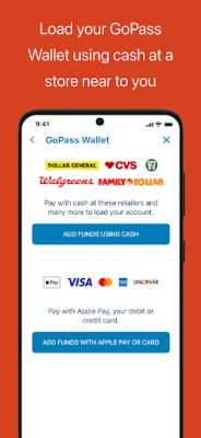 - Cash to mobile option allowing you to load cash to your GoPass Wallet at retail locations.